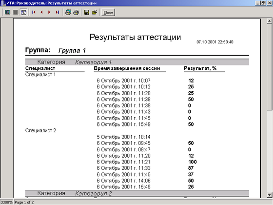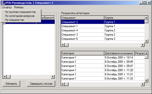 После выбора специалиста в нижнем окне появляется все результаты аттестации по выбранному специалисту. Для того чтобы построить комплексный отчёт необходимо выбрать меню отчёты ,в котором можно просмотреть текущее состояние законченных сессий аттестации по выбранным категориям рисунок 10.3.1.При необходимости можно вывести комплексный отчет по результатам аттестации ,показанный на рисунке 10.3.2,в котором предлагается возможность более детальное ознакомление с результатами в процентном содержании полученных данных ,время завершении сессии, дата и другое ,а также вспомогательные функции такие как распечатка на принтер, запись в файл и т.д.
