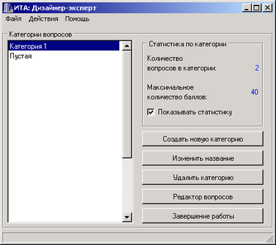 этом окне (рис.10.2.2) можно создать новую категорию вопросов, удалить категорию, изменить название категории, а так же посмотреть статистику – количество вопросов в категории и максимальное количество балов. При удалении категории удаляются все вопросы, входящие в эту категорию. Переход в режим редактирования вопросов в категории осуществляется нажатием соответствующей кнопки.