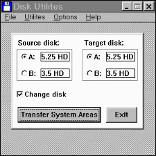 Требуется задать имя исходного диска и имя диска, на который будет производиться перенос системных областей. Также можно задать: менять или не менять дискету в дисководе, если используется одно устройство. Этим достигается то, что можно очистить дискету от записей практически мгновенно (попробуйте стереть с дискеты около 100 файлов - разница становиться заметной и без замеров по секундомеру. А если файлов больше?).