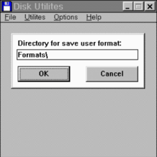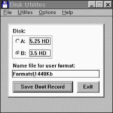 Требуется задать имя диска (A: или B:), тип формата (180 Kb, 360 Kb, 720 Kb, 800 Kb, 1.2 Mb, 1.44 Mb, 1.6 Mb). Также формат можно задать как “auto detect” (автоматическое определение типа формата) или “user format”. При “user format” надо задать имя файла, содержащего загрузочную запись (512 байт). Поэтому нет ограничения на количество форматов, и стандартно поддерживаются только семь - самых основных. Пользователь может сам создать загрузочную запись, содержащую требующийся ему формат, с помощью утилиты “Save User Boot Record”, описание которой вы найдете чуть дальше.