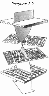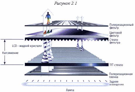 кран LCD монитора представляет собой массив маленьких сегментов (называемых пикселями), которыми можно манипулировать для отображения информации. LCD монитор имеет несколько слоев, где ключевую роль играют две панели, сделанные из свободного от натрия и очень чистого стеклянного материала, называемого субстрат или подложка, которые собственно и содержат тонкий слой жидких кристаллов между собой [см. рис. 2.1]. На панелях имеются бороздки, которые направляют кристаллы, сообщая им специальную ориентацию. Бороздки расположены таким образом, что они параллельны на каждой панели, но перпендикулярны между двумя панелями. Продольные бороздки получаются в результате размещения на стеклянной поверхности тонких пленок из прозрачного пластика, который затем специальным образом обрабатывается. Соприкасаясь с бороздками, молекулы в жидких кристаллах ориентируются одинаково во всех ячейках. Молекулы одной из разновидностей жидких кристаллов (нематиков) при отсутствии напряжения поворачивают вектор электрического (и магнитного) поля в световой волне на некоторый угол в плоскости, перпендикулярной оси распространения пучка. Нанесение бороздок на поверхность стекла позволяет обеспечить одинаковый угол поворота плоскости поляризации для всех ячеек. Две панели расположены очень близко друг к другу. Жидкокристаллическая панель освещается источником света (в зависимости от того, где он расположен, жидкокристаллические панели работают на отражение или на прохождение света).