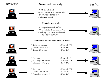 Рисунок, представленный ниже, иллюстрирует то, как взаимодействуют методы обнаружения атак на системном и сетевом уровнях при создании более эффективной системы сетевой защиты. Одни события обнаруживаются только при помощи сетевых систем. Другие – только с помощью системных. Некоторые требуют применения обоих типов обнаружения атак для надежного обнаружения.