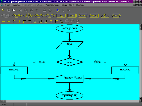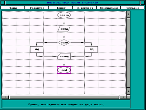 Система состоит из оболочки, графического редактора блок-схем, встроенного текстового редактора, интерпретатора, пошагового отладчика и конвертора на язык Си.