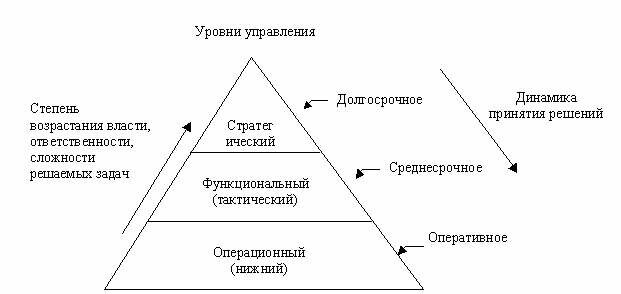 На рис 1.2. отображены три уровня управления, которые соотнесены с такими факторами, как степень возрастания власти, ответственности, сложности решаемых задач, а также динамика принятия решений по реализации задач.