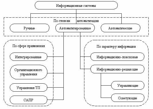 Экспертные информационные системы обеспечивают выработку и оценку возможных альтернатив пользователем за счет создания экспертных систем, связанных с обработкой знаний. Экспертная поддержка принимаемых пользователем решений реализуется на двух уровнях. Работа первого уровня экспертной поддержки исходит из концепции "типовых управленческих решений", в соответствии, с которой часто возникающие в процессе управления проблемные ситуации можно свести к некоторым однородным классам управленческих решений, т.е. к некоторому типовому набору альтернатив. Для реализации экспертной поддержки на этом уровне создается информационный фонд хранения и анализа типовых альтернатив. Если возникшая проблемная ситуация не ассоциируется с имеющимися классами типовых альтернатив, в работу должен вступать второй уровень экспертной поддержки управленческих решений. Этот уровень генерирует альтернативы на базе имеющихся в информационном фонде данных, правил преобразования и процедур оценки синтезированных альтернатив. 2.3 ПРОЧИЕ КЛАССИФИКАЦИИ ИНФОРМАЦИОННЫХ СИСТЕМКлассификация по степени автоматизации В зависимости от степени автоматизации информационных процессов в системе управления фирмой информационные системы определяются как ручные, автоматические, автоматизированные . Ручные ИС характеризуются отсутствием современных технических средств переработки информации и выполнением всех операций человеком. Например, о деятельности менеджера в фирме, где отсутствуют компьютеры, можно говорить, что он работает с ручной ИС. Автоматические ИС выполняют все операции по переработке информации без участия человека. Автоматизированные И С предполагают участие в процессе обработки информации и человека, и технических средств, причем главная роль отводится компьютеру. В современном толковании в термин "информационная система" вкладывается обязательно понятие автоматизируемой системы. Автоматизированные ИС, учитывая их широкое использование в организации процессов управления, имеют различные модификации и могут быть классифицированы, например, по характеру использования информации и по сфере применения. Рис. 1.6. Классификация информационных систем по разным признакам Классификация по характеру использования информации Информационно-поисковые системы (см. рис. 1.6) производят ввод, систематизацию, хранение, выдачу информации по запросу пользователя без сложных преобразований данных. Например, информационно-поисковая система в библиотеке, в железнодорожных и авиа кассах продажи билетов. Информационно-решающие системы осуществляют все операции переработки информации по определенному алгоритму. Среди них можно провести классификацию по степени воздействия выработанной результатной информации на процесс принятия решений и выделить два класса: управляющие и советующие. Управляющие ИС вырабатывают информацию, на основании которой человек принимает решение. Для этих систем характерны тип задач расчетного характера и обработка больших объемов данных. Примером могут служить система оперативного планирования выпуска продукции, система бухгалтерского учета. Советующие ИС вырабатывают информацию, которая принимается человеком к сведению и не превращается немедленно в серию конкретных действий. Эти системы обладают