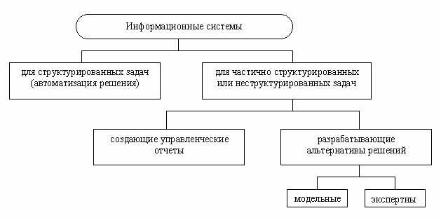 2.2 КЛАССИФИКАЦИЯ ИНФОРМАЦИОННЫХ СИСТЕМ ПО ПРИЗНАКУ СТРУКТУРИРОВАННОСТИ ЗАДАЧПонятие структурированности задачПри создании или при классификации информационных систем неизбежно возникают проблемы, связанные с формальным - математическим и алгоритмическим описанием решаемых задач. От степени формализации во многом зависят эффективность работы всей системы, а также уровень автоматизации, определяемый степенью участия человека при принятии решения на основе получаемой информации. Чем точнее математическое описание задачи, тем выше возможности компьютерной обработки данных и тем меньше степень участия человека в процессе ее решения. Это и определяет степень автоматизации задачи. Различают три типа задач, для которых создаются информационные системы: структурированные (формализуемые), неструктурированные (не формализуемые) и частично структурированные. Структурированная (формализуемая) задача - задача, где известны все ее элементы и взаимосвязи между ними. Неструктурированная (не формализуемая) задача - задача, в которой невозможно выделить элементы и установить между ними связи. В структурированной задаче удается выразить ее содержание в форме математической модели, имеющей точный алгоритм решения. Подобные задачи обычно приходится решать многократно, и они носят рутинный характер. Целью использования информационной системы для решения структурированных задач является полная автоматизация их решения, т.е. сведение роли человека к нулю. Типы информационных систем, используемые для решения частично структурированных задач Информационные системы, используемые для решения частично структурированных задач, подразделяются на два вида (Рис. 1.5): создающие управленческие отчеты и ориентированные главным образом на обработку данных (поиск, сортировку, агрегирование, фильтрацию). Используя сведения, содержащиеся в этих отчетах, управляющий принимает решение; Рис. 1.5. Классификация информационных систем по признаку структурированности решаемых задач разрабатывающие возможные альтернативы решения. Принятие решения при этом сводится к выбору одной из предложенных альтернатив. Информационные системы, создающие управленческие отчеты, обеспечивают информационную поддержку пользователя, т.е. предоставляют доступ к информации в базе данных и ее частичную обработку. Процедуры манипулирования данными в информационной системе должны обеспечивать следующие возможности: