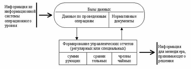 Хранение данных. Многие данные на уровне операционной деятельности необходимо сохранять для последующего использования либо здесь же, либо на другом уровне. Для их хранения создаются базы данных. Создание отчетов (документов). В информационной технологии обработки данных необходимо создавать документы для руководства и работников фирмы, а также для внешних партнеров. При этом документы или в связи с проведенной фирмой операцией так и периодически в конце каждого месяца, квартала или года. 4.2 ИНФОРМАЦИОННАЯ ТЕХНОЛОГИЯ УПРАВЛЕНИЯХарактеристика и назначениеЦелью информационной технологии управления является удовлетворение информационных потребностей всех без исключения сотрудников фирмы, имеющих дело с принятием решений. Она может быть полезна на любом уровне управления. Эта технология ориентирована на работу в среде информационной системы управления и используется при худшей структурированности решаемых задач, если их сравнивать с задачами, решаемыми с помощью информационной технологии обработки данных. ИС управления идеально подходят для удовлетворения сходных информационных потребностей работников различных функциональных подсистем (подразделений) или уровней управления фирмой. Поставляемая ими информация содержит сведения о прошлом, настоящем и вероятном: будущем фирмы. Эта информация имеет вид регулярных или специальных управленческих отчетов. Для принятия решений на уровне управленческого контроля информация должна быть представлена в агрегированном виде так, чтобы просматривались тенденции изменения данных, причины возникших отклонений и возможные решения. На этом этапе решаются следующие задачи обработки данных: