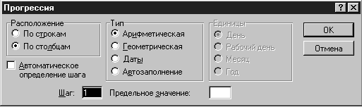 В окне можно выбрать тип прогрессии Арифметическую, Геометрическую, Даты и Автозаполнение и как она будет заполняться По строкам или По столбцам.