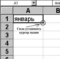 В ячейку вводится первый член ряда. Указатель мыши подвести к черному квадрату в правом нижнем углу выделенной ячейки (в этот момент белый крестик переходит в черный) и нажать левую кнопку мыши. Удерживая нажатой кнопку мыши, выделите нужную часть строки или столбца. Выделенная область заполнится данными.