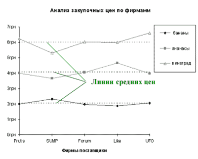 Линии средних цен нужно отформатировать иначе, чем это делает мастер. Их нужно сделать того же цвета, что и линии закупочных цен, убрать маркеры и сделать пунктирными.