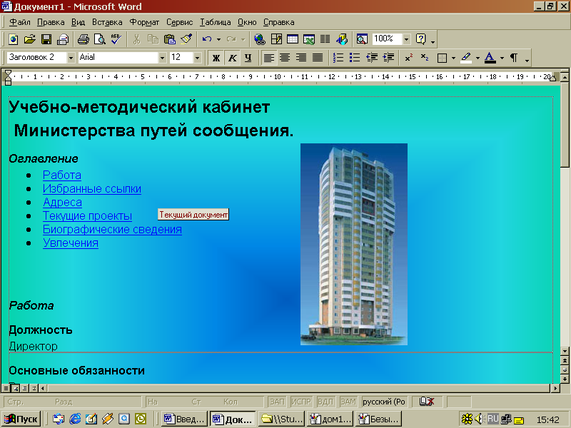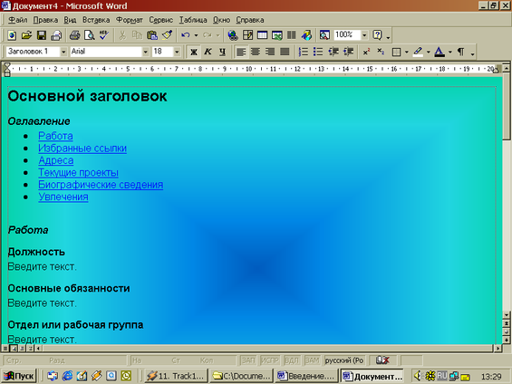 Там предложено несколько вариантов разметки страницы (личная основная страница, оглавление, обзор, регистрационная форма и т. п.), и стилей цветового оформления, из которых всегда можно выбрать подходящий. Эти шаблоны могут многому научить пользователя. Microsoft Word позволяет открывать готовые HTML-документы. Так же когда сохраняют документы Интернет c помощью средства просмотра ресурсов (Microsoft Internet Explorer), надо выбирать формат HTML. Это поможет сохранить форматирование и использовать его в своей дальнейшей работе. Лучший инструмент редактирования этих документов на рабочем месте - Microsoft Word 97.