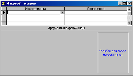 Аналогично можно создавать макрокоманда, перетаскивая из окна База данных таблицы, запросы, отчеты и другие макросы. При этом будут создаваться соответствующие макрокоманды: ОткрытьТаблицу, ОткрытьЗапрос, ОткрытьОтчет, ЗапускМакроса.