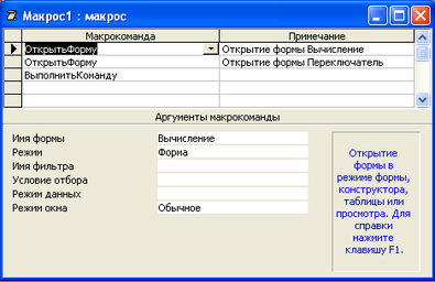 Тогда в поле Макрокоманда автоматически появится макрокоманда ОткрытьФорму, а на панель аргументов автоматически заполняются поля: в поле Имя формы появляется имя формы “Вычисление”, в поле Режим – значение по умолчанию Форма, в поле Режим окна – значение Обычное. Остальные поля останется пустыми.