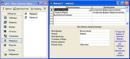 Макрос в Access представляет собой структуру, состоящую из одной или нескольких макрокоманд, которые выполняются либо последовательно, либо в порядке, заданном определенными условиями. Набор макрокоманд в Access очень широк, с помощью макросов можно реализовать многое из того, что позволяют сделать процедура на VBA. Каждая макрокоманда имеет определенное имя и, возможно, один или несколько аргументов, которые задаются пользователем. Например, при использовании макрокоманды ОткрытьФорму в качестве аргументов необходимо задать, по крайней мере, имя открываемой формы и режим вывода ее на экран.