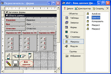 Откройте форму Переключатель в режиме конструктора и перетащите макрос из окна базы данных в область заголовка формы.