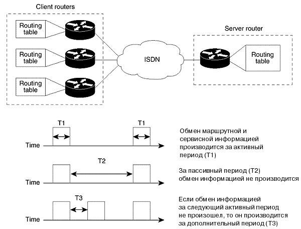 В том случае, если за время следующего активного периода маршрутизатор не получает ни одного пакета обновлений, то через заданный промежуток времени (интервал T3) он может активизировать линию связи с тем, чтобы убедиться в наличии маршрутизатора или другого устройства на другом конце линии связи. Например, такая ситуация возможна в том случае, если телефонный номер DDR или интерфейс был временно недоступен во время активного периода.