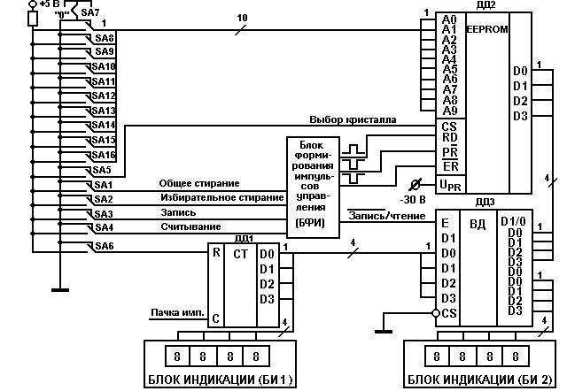 Блок индикации БИ2, расположенный на панели справа, регистрирует данные, считываемые из РПЗУ. Информация на блоке индикации может быть представлена как в двоичной, так и в десятичной форме,