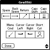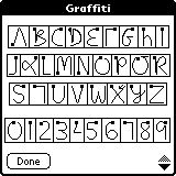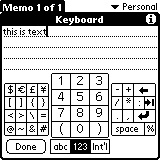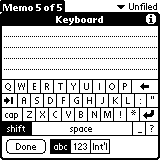 В PalmOS есть 2 способа ввода теста, можно либо писать рукой стилусом либо набирать на маленькой нарисованной клавиатуре (рис 3,4). Писать текст рукой можно с помощью граффити , при этом каждый символ имеет упрощенное начертание как показано на рис 2. Обычно маленькая виртуальная клавиатура помогает новичкам, печатать на ней нужно не руками а стилусом.