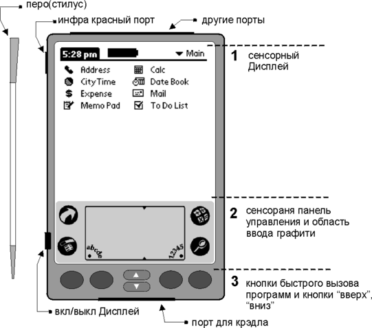 На рис.1 показан вид простого КПК (Карманный персональный Компьютер) под управлением ОС PalmOS 3.1. Все модели КПК имеют свой неповторимый дизайн и поэтому размер и расположение кнопок может отличаться.