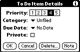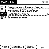 риложение To Do List (Дела) предназначено для хранения списка дел, которые необходимо выполнить. Пользователь вводит список дел в Pilot, а по мере их выполнения, напротив каждого ставит галочку. Каждому делу можно назначить приоритет. Дела с высоким приоритетом отображаются в начале списка, с низким– в конце. Любому делу можно назначить последний срок исполнения. Если пользователь не выполнит его в срок, т. е. не поставит галочку, то справа от него появится восклицательный знак. Как и в Адресной книжке, дела можно разбить на категории.