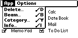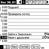 помощью программы Date Book (Расписание) Вы никогда не забудете, что и когда Вам нужно сделать. Pilot напомнит Вам сиреной о назначенном событии. При запуске этого приложения на экране появляется список всех дел, которые пользователь запланировал на текущий день. Date Book позволяет назначать события на несколько лет вперед, и их всегда можно будет изменить или удалить, например можно вести расписание уроков. Программа может показать 3 вида всех ваших дел : расписание 1го дня, всей недели, всего месяца.