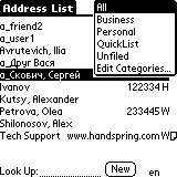 дресная книжка (Address) очень удобная программа для записи, хранения адресов и дополнительной информации. Запустить ее можно, выбрав иконку в списке приложений или нажав вторую слева кнопку на корпусе. Все записи в адресной книге располагаются строго в алфавитном порядке и представлены в виде визитных карточек: фамилия, имя, адрес, телефон, e-mail и т. д. В программе Address реализован быстрый поиск. Все записи в адресной книжке можно разбить на категории, название которых Вы можете задать сами. Фактически пользователь получает несколько адресных книжек. Например, в категории Бизнес у Вас хранятся деловые записи, а в категории Персональные – записи о ваших друзьях. При нажатии стилусом на изображении активной категории в правом верхнем углу экрана – можно увидеть список всех категорий.