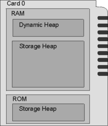 Физически память расположена на картах памяти – Card0, Card1,... Каждая карта памяти может иметь RAM и ROM сегменты. Все пространство RAM сегмента разделено на Dynamic RAM и Storage RAM . Storage RAM это эквивалент диска (HDD), там находятся только файлы. Dynamic RAM это эквивалент обычной памяти. В Dynamic RAM находятся все динамические объекты программы и ОС , стек, или просто блоки памяти которыми управляет программа (кроме самих программ) .