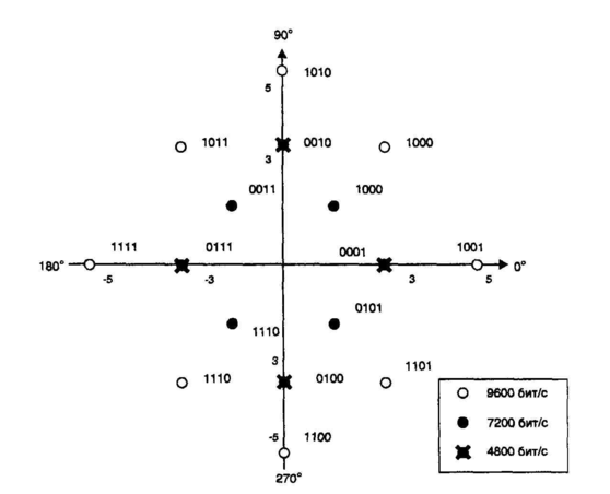 При скорости 9600 бит/с в соответствии с диаграммой на рис. 3.6 применяется сигнал КАМ-16 с четырьмя градациями амплитуды и восемью градациями фазы. На скорости 7200 бит/с при объединении в блок трех бит достаточно 8-и позиционного сигнала. Согласно V.29 в этом случае используются 2 значения амплитуды (3 и v2) и все 8 градаций фаз. Трехбитный блок образуют 3 последние цифры комбинаций, указанных на рис. 3.6.
