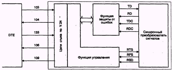 Рис. 4.3. Цепи, работающие при защите от ошибок, где TD — передаваемые данные; RD — принимаемые данные; TDC — синхронизация передаваемых данных; RDC — синхронизация принимаемых данных; RTS — запрос передачи; RFS — готовность к передаче; RSD — детектор принимаемого линейного сигнала из канала данных.