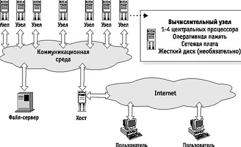 В качестве вычислительных узлов в кластере обычно используются однопроцессорные персональные компьютеры, двух- или четырехпроцессорные SMP-серверы. Каждый узел работает под управлением своей копии операционной системы, в качестве которой чаще всего используются стандартные операционные системы: Linux, NT, Solaris и т.п. Состав и мощность узлов может меняться даже в рамках одного кластера, давая возможность создавать неоднородные системы. Выбор конкретной коммуникационной среды определяется многими факторами: особенностями класса решаемых задач, необходимостью последующего расширения кластера и т.п. Возможно включение в конфигурацию специализированных компьютеров, например, файл-сервера, и, как правило, предоставлена возможность удаленного доступа на кластер через Internet.