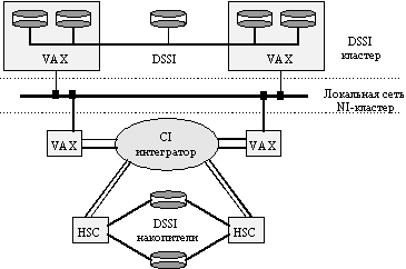 Ethernet, используя NI - Network Interconnect (так называемые локальные VAX-кластеры), однако производительность таких систем сравнительно низкая из-за необходимости делить пропускную способность сети Ethernet между компьютерами кластера и другими клиентами сети.