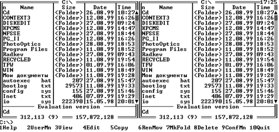 После запуска Norton Commander на экране появляются два прямоугольных окна (панели).