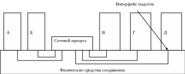 Она состоит из коммуникационной системы и пяти (А—Д) групп двухточечных физических соединений. Каждая группа соединений (как и на рис. 3.3) заканчивается аппаратурой передачи данных, изображенной здесь полукругом. Группа физических соединений с парой аппаратур передачи данных, расположенных по концам соединений, представляет канал. В точках интерфейса подсети к ней могут подключаться абонентские системы(А-Д).