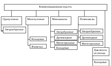 соответствии с определением коммуникационной подсети выделим пять ее типов: одноузловая, многоузловая, моноканальная, поликанальная, циклическое кольцо.