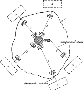 Одноузловая коммуникационная подсеть состоит (рис.3) из одной коммуникационной системы (заштрихованный кружок) и группы абонентских каналов, каждый из которых соединяет абонентскую систему с коммуникационной. Этим и определяется название подсети. Каждый канал заканчивается аппаратурой передачи данных, к которой с наружной части подсети подключаются абонентские системы (пунктирные прямоугольники А—Д). Точки подключения абонентских систем к аппаратуре передачи данных, определяют интерфейс коммуникационной подсети. Естественно, что одноузловая подсеть может иметь только одну форму звездообразную.