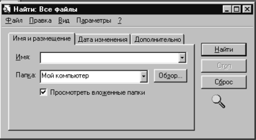 Первая вкладка - Имя и размещение. В ней можно указывать имя нужного файла, а также диск или папку, где следует искать этот файл. При указании имени файла можно использовать символы * и ?. Они подставляются вместо тех частей имени, которые пользователь не помнит. "Звездочка" заменяет произвольную последовательность символов, а "вопросительный знак" - только один символ. Можно указывать только несколько букв из имени. Во второй вкладке можно выбрать дату изменения искомого файла. В последней вкладке можно выбрать тип файла и текст, который в нем содержится. После указания всех критериев поиска следует нажать кнопку Найти. В нижней части окна поиска отобразится список всех файлов, удовлетворяющих Вашему запросу.