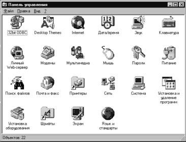 Панель управления - это специальная папка, в которой собраны многочисленные средства для настройки компьютера, подключения нового оборудования, установки программ. Окно панели управления содержит множество пиктограмм (значков), каждая из которых соответствует одному из разделов этой программы (рис. 9). Для входа в любой из этих разделов надо щелкнуть два раза его пиктограмму, и на экране появится диалоговый запрос, соответствующий данному разделу. вы можете изменить те или иные параметры в этом запросе и нажать кнопку запроса OK для их установки. Для выхода без изменения параметров нажимайте кнопку Отмена (Cancel или клавишу Esc).