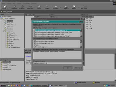 Такая проблема сможет возникнуть у вас, когда вы подпишитесь на какие-нибудь рассылки, например анекдоты, новости, футбол и т.д. Ведь разбирать полученные письма в энном количестве. Запутаться в них будет очень и очень просто. А если вы рассортируете входящие письма в отдельные папки, то вам будет очень удобно в них разобраться. Вернее не вы их будете сортировать, а трудяга Outlook автоматически по приходу почты их рассортирует, куда указано. Рассортировать письма очень легко. Вам придётся открыть окно Сервис/правила для сообщений/Почта. В меню правила для почты вы должны нажать кнопку создать, указать от кого или с какой темой перемесить в папку, например Я ЛЮБИМЫЙ. Всё правило для почты создано. Теперь письма, например с темой «Я и моя семья» будут автоматически попадать в папку Семья. Но для начала вам самим придется создать эту самую папку Семья.