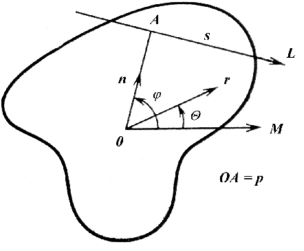 Рис. 1.2 поясняет результаты инверсии Радона в двумерном случае. Пусть L — луч, пересекающий объект, s — измеряемое вдоль него расстояние, О — начало системы координат, — угол между базисной линией ОМ, лежащей в выбранной плоскости, и перпендикуляром, опущенным из О на L, р — кратчайшее расстояние от О до L, n — орт, определяемый тем же углом . В этих обозначениях можно записать