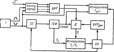 Формируемый ток смещения соответствует установившемуся значению выходного сигнала контролируемого ЦАП. Каждую анализируемую точку переходного процесса стробируют п раз с частотой f 2 генератора Г. По мере приближения выходного тока контролируемого ЦАП к току смещения дополнительного ЦАП частота срабатывания f1 дискриминатора Д на туннельном диоде возрастает. Отношение частот f1/f2 анализируют устройством управления УУ. Если оно находится в допустимых пределах заданного значения, то стробирующий .импульс перемещают к началу переходного процесса и анализ следующих точек переходного процесса повторяют до момента, когда отношение частот f1/f2 превысит заданное (последнее определяется допустимым отклонением выходного тока контролируемого ЦАП от установившегося значения, а также характером шумовой помехи на туннельном диоде и видом зависимости частоты срабатывания схемы сравнения от тока смещения). После этого перемещение стробирующего импульса прекращают и измеряют временной отрезок между фронтами импульсов генератора и стробирующих импульсов ГСИ. Следует, однако, отметить, что вследствие большого уровня шумов, временной и температурной нестабильности параметров туннельного диода данная схема обеспечивает контроль ЦАП с разрядностью не более 8—9.