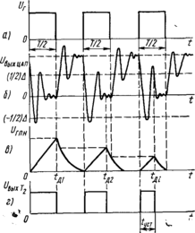 Формируемые с частотой генератора Г перепады (от нуля до установившегося уровня) выходного сигнала ЦАП попадают па дискриминатор уровня Д, который анализирует текущее (мгновенное) значение выходного сигнала преобразователя.