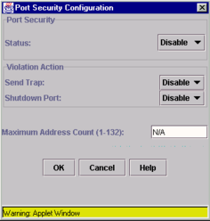 В свитчах серии Catalyst 2900XL возможен вариант ограничения доступа к порту по mac адресам. Для вывода на экран диалога конфигурации безопасности порта, выберите из всплывающего меню порта пункт Port Security. Отобразится окно примерно следующего содержания: