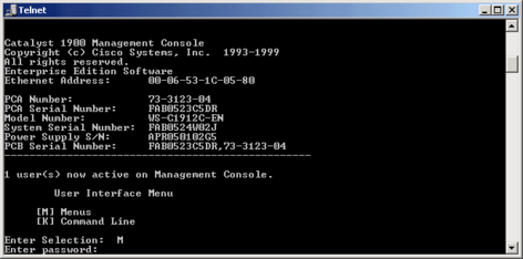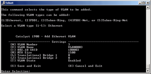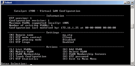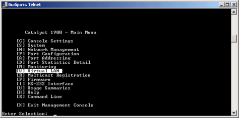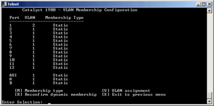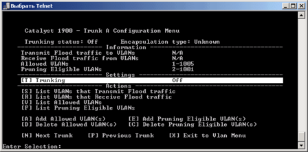 Для свитчей серии CISCO Catalyst 1900 нет поддержки мультиVLAN и вы должны назначать портам только типы static и trunk. Для управления коммутатором через CLI используется весьма удобная система меню: