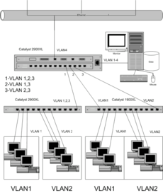 При такой схеме обязателен роутер или поддержка протокола ISL, IEEE 802.1Q сервером. Кроме этого доступна единая конфигурация VLAN через домен VTP: