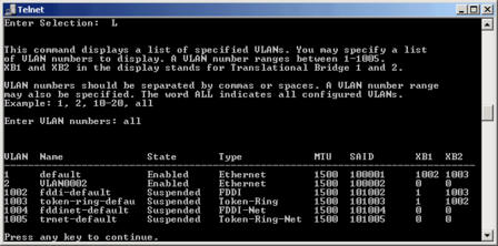 Для просмотра состояния VLAN нажмите L а затем на вопрос о диапазоне VLAN можно указать all для просмотра всех VLAN: