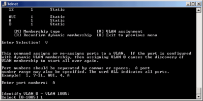 Для того, чтобы использовать какую-либо VLAN еЈ необходимо добавить(в свитчах поздних серий это делается неявно, когда вы впервые эту VLAN используете): для этого в основном меню VLAN нажмите A и следуйте инструкциям: