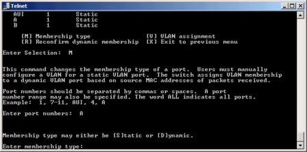 Вначале показывается информация о текущей конфигурации, а затем меню для изменения оной. Для изменения типа VLAN для порта(статический или динамический) и спользуется меню Membership type - M: