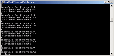 Во-первых, есть весьма существенные различия CLI у свитчей серий 2900 и 1900, а посему рассматривать их нужно отдельно. НачнЈм со свитчей серии 2900. Итак, вы подсоединили нуль-модемный кабель или запустили сеанс telnet. Во-первых на приглашение HOST_NAME> надо ответить enable и ввести пароль к свитчу, для получения доступа к конфигурации. Для просмотра сведений о свитче наберите show running-config. Подсказка по интерфейсу CLI. Здесь есть такие удобства как автозаполнение кнопкой TAB - наберите начало команды, например show ru, и оно расширится в show running-config. Можно в любой момент получить справку по любому вопросу: просто нажмите ? и вам будут предложены возможные параметры команды, например show ?. Для повторения предыдущих или следующих команд можно использовать курсоры вверх или вниз. Для пролистывания текста при запросе --more-- нажимайте пробел для опускания текста вниз на строку. Итак, вы набрали show running-config и здесь отобразится информация. Вначале общая информация о свитче (адрес, имя, адреса шлюз и.т.д.), а затем информация о портах. Здесь особое внимание я бы хотел обратить на информацию о режиме VLAN порта: switchport mode %%%%. Access - режим статической VLAN; Multi - мультиVLAN порт; Trunk - режим trunk магистрали; Dynamic - VPMS режим. Следующий параметр switchport показывает особые параметры для данного типа порта. Например для access это единственный идентификатор VLAN, для multi - список допустимых VLAN, разделЈнных запятой или -, для указания промежутка VLAN.Таким образом, после сделанных изменений неплохо было бы смотреть, что именно произошло.