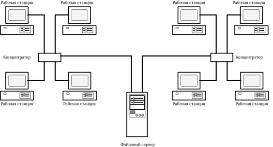 Выбор той или иной топологии диктуется соображениями удобства прокладки сетевого кабеля, необходимостью наращивания ЛИВС и расстоянием между рабочей станцией и файловым сервером (оно не должно превышать 150м).