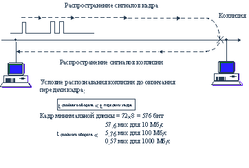 Длина сегмента Ethernet всегда ограничена очень жестким соотношением, которое вряд ли можно преодолеть за счет технического прогресса. Для того, чтобы конечные узлы сети всегда четко распознавали коллизии и автоматически организовывали повторную передачу искаженного в результате коллизии кадра, нужно, чтобы время передачи кадра всегда было больше времени двойного оборота сигнала по сегменту Ethernet (рис.2.2). Так как время распространения сигнала ограничено скоростью света, то максимальная длина сегмента Ethernet для битовой скорости 10 Мб/c составляет примерно 2500 м. При увеличении битовой скорости в 10 раз и сохранении минимального размера кадра в 64 байта максимальный размер сегмента сокращается соответственно в 10 раз, то есть становится равным 250 метрам, а при увеличении битовой скорости еще в 10 раз - 25 метрам.